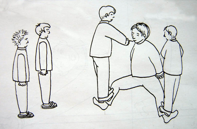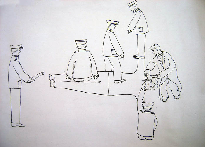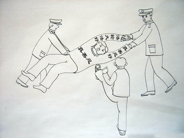 大法弟子在看守所打扫卫生时,捡到一支笔。穿着自己制作的衣服,恶警拼命的往下扯大法弟子衣服。