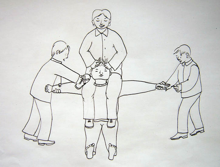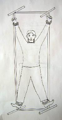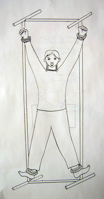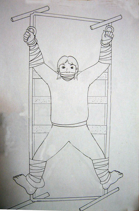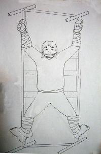 把大法弟子架在空铁床上,只垫三块木头板,每块只有10厘米左右宽,木板上有很多刺,扎在身上很疼。最上面一块只垫住肩膀和后脑勺,而脑袋大部份还悬在外面很难受。