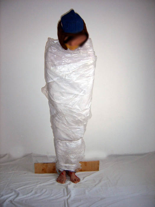 把大法弟子先戴上手铐和脚镣,再浑身缠上塑料,包括头,只留两眼和鼻孔几处窟窿。头上缠完塑料后又用棉帽戴上,捂得很紧。在膝盖下方用绳子缠上,后面缠在小笼子上,勒的很痛。