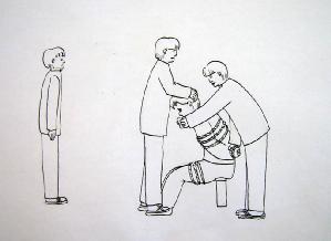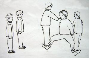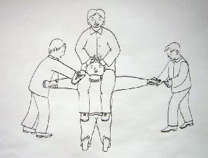 把大法弟子身上绑上绳子,手用绳子绑上,前面有一个犯人踩脚背,并且拽头发用力往下摁头,还有一个犯人等着轮班踩脚背。大法弟子后背有一个犯人把着大法弟子的手不让动,把大法弟子嘴里塞上抹布,不让喊大法好。
