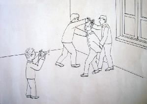 大法弟子绝食,七八个警察和恶狱医共同迫害大法弟子,在地上野蛮灌食。有两个恶警把大法弟子胳膊拉开踩住大法弟子的两手,并且用穿皮鞋的脚捻手;有一个恶警用一只脚往大法弟子的胸口及肚子跺;一个恶警坐在大法弟子腿上;还有的恶警拿着电棍。恶狱医则蹲在地上快速用小勺灌食,也根本不管大法弟子能否喘上气来,倒的满头满脸全是灌食的苞米糊,苞米糊不知兑的什么。