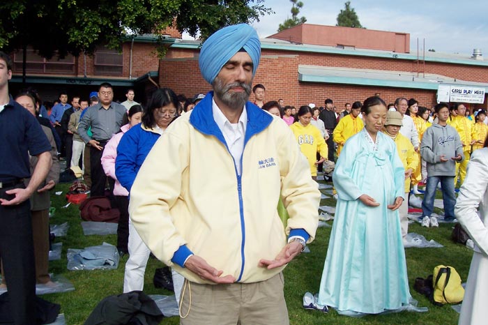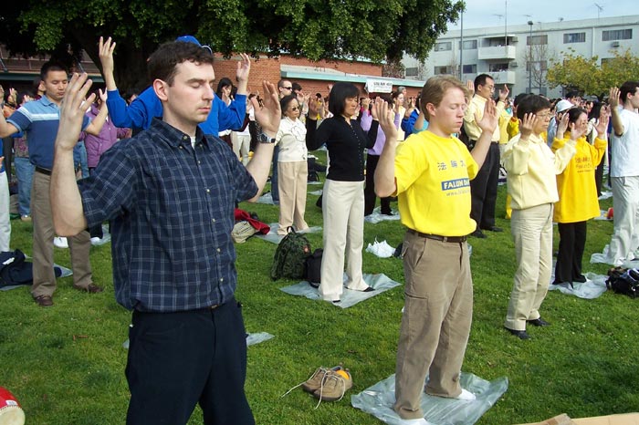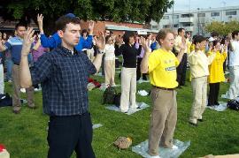 当日的洛杉矶天气和暖、阳光灿烂,上午8点不到学员们就陆陆续续来到中国城公园集体炼功。盛大的场面,祥和的气氛,吸引了不少路人驻足观看,有的拍照留念,有的了解真相,还有的询问哪有炼功点。