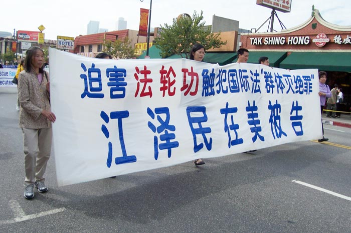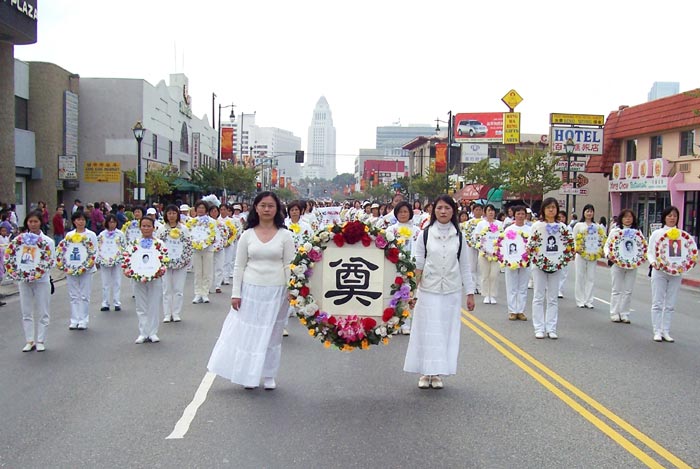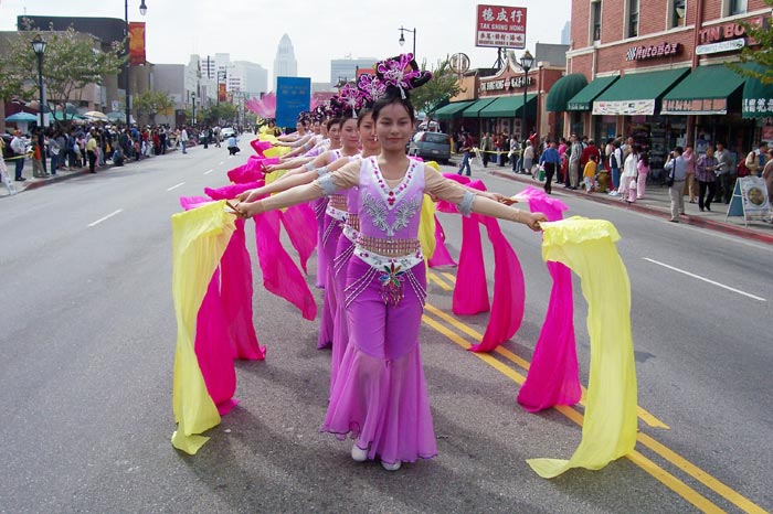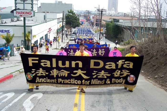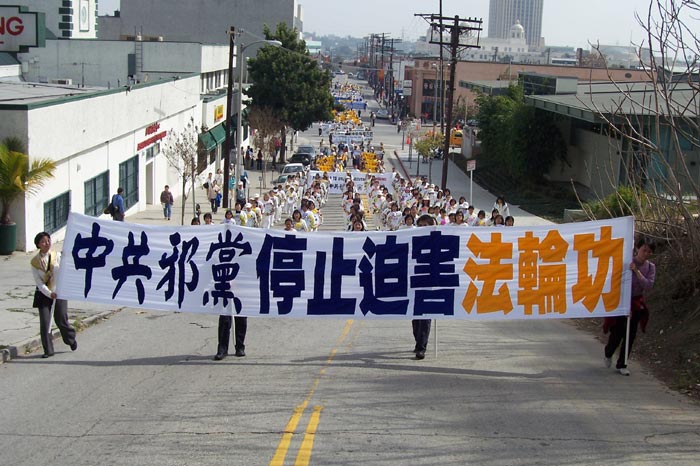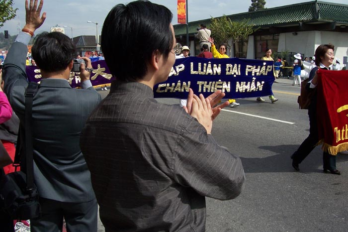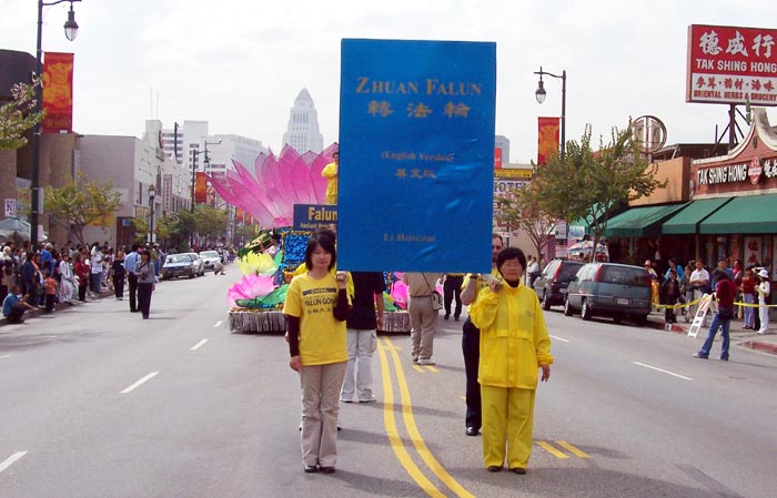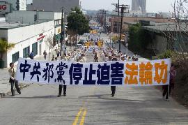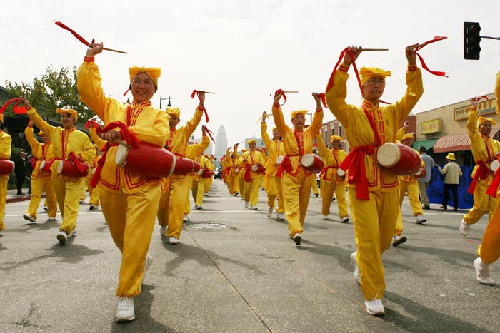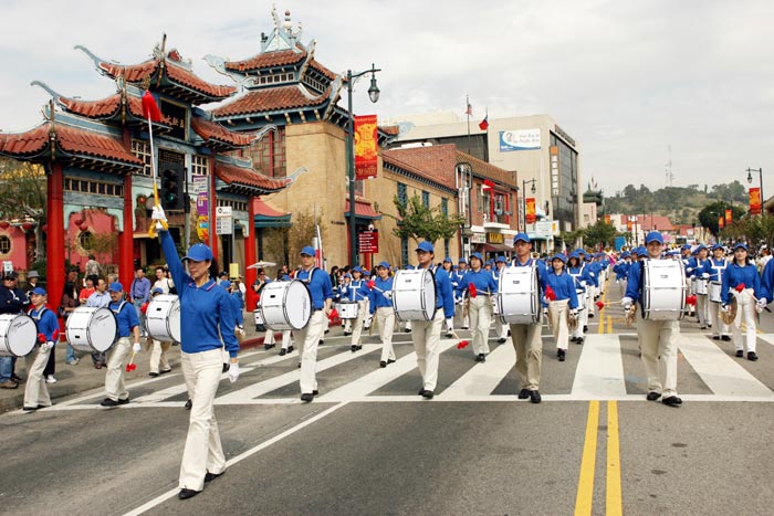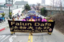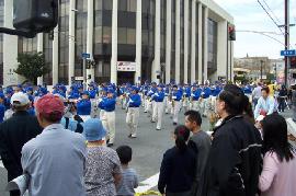 二千多人的游行队伍走在唐人街的中心街道,场面非常壮观;特别是法轮功学员组成的2百多人的天国乐队,鼓号声震撼人心,感人心扉;许多人看呆了,还有不少民众从楼房里走出来观看。