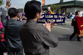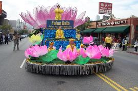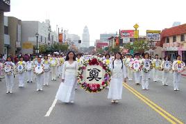 之后是大游行,队伍由气势磅礴的天国乐队开路,鼓乐声响彻云霄;随后是仙女队、花车,以及揭露迫害、反迫害等队伍,绵延十几个街区,许多观众看得呆住了。很多路人表示是首次看到法轮功的游行;不少人在队伍走过了一半才反应过来,而感叹于队伍的浩荡。