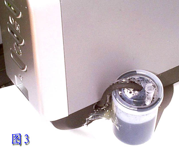 参照【明慧网2005年12月30日】的技术文章:《电子书:佳能IP4200连供实例改装》时(以下简称电子书),发现有一处重要的疏漏,佳能IP系列的打印机从IP3000就是对应彩色、黑白墨盒的两组喷头清洗泵系统,IP4200的废墨导管也是两条,电子书参考图只引出了其中的一条,还有一条是在打印机下面的金属架内侧的黑色胶皮管,长度足够引到机壳以外,(如图3)用热融胶把一个装胶卷的塑料盒粘在打印机的边壳外面,用小刀在胶卷盒上盖刻一个圆孔,把两条废墨管穿过圆孔,废墨满时用针管吸出即可。请还没有把废墨管引出打印机的同修尽快参照电子书动手,以免废墨过多时,水漫金山伤到打印机就麻烦了!