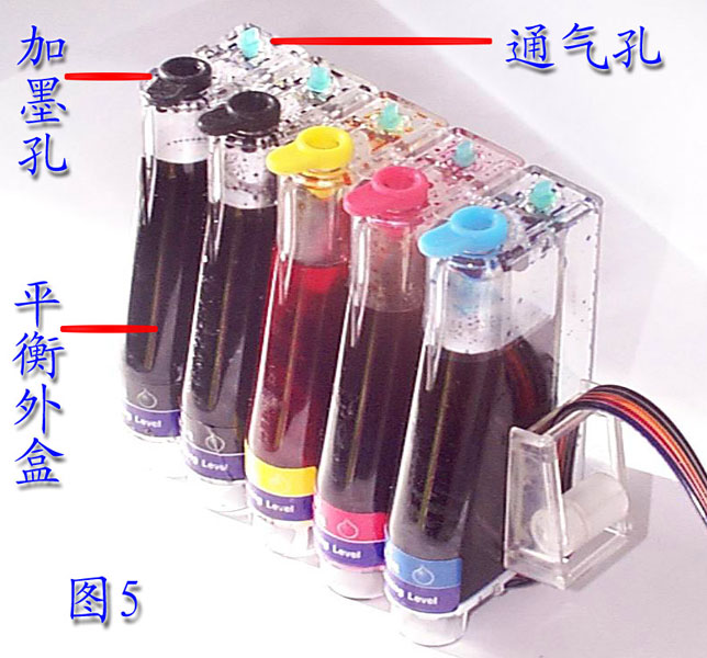 如果买到的是如图5的外置平衡墨盒,请采用如下的加墨方法:塞紧通气孔的小胶塞,打开加墨孔的大胶塞加墨水,注满后塞紧大胶塞就完成加墨了。每次打印时需要先把通气孔的小胶塞打开,大胶塞不用打开,打印完成关闭打印机之后再把小胶塞塞紧。