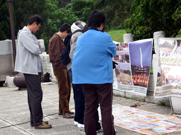 一位三重市的李姓法轮功学员说,从年初一就每天来故宫洪法讲真相,他想中国大陆的民众也应会趁放年假出国观光,为把握这机会告诉大陆民众在国内听不到的消息,他于是牺牲自己的过年假期每天骑摩托车往返一个多小时来此。