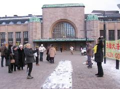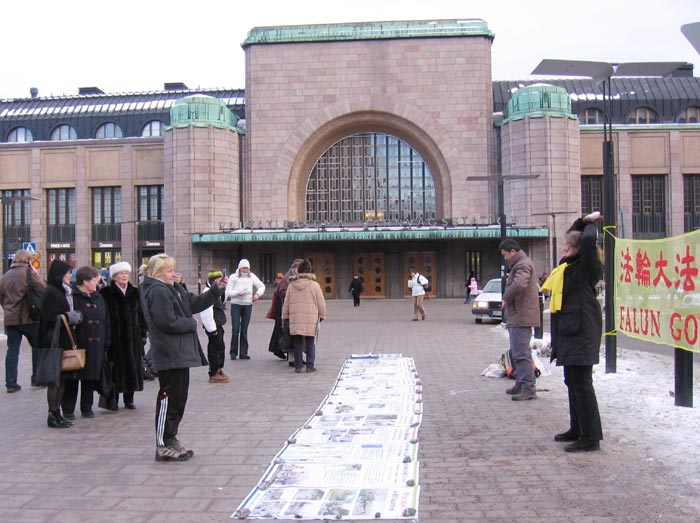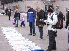 一到场地,大家立即挂起醒目的“法轮大法好”等横幅;摆放了十几幅介绍法轮大法洪传世界和揭露中共政权迫害法轮功的真相图片及呼吁制止迫害的征签簿。学员们有的演示功法,有的向过往民众散发真相资料。没有人指挥,但一切做得井然有序,配合十分默契。匆忙赶路的人们被祥和的功法、醒目的横幅、揭露迫害真相的照片所吸引,纷纷驻足观看了解。