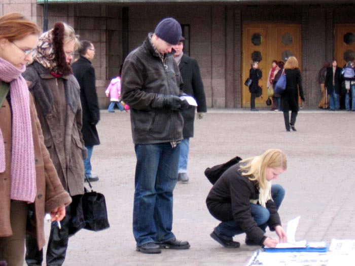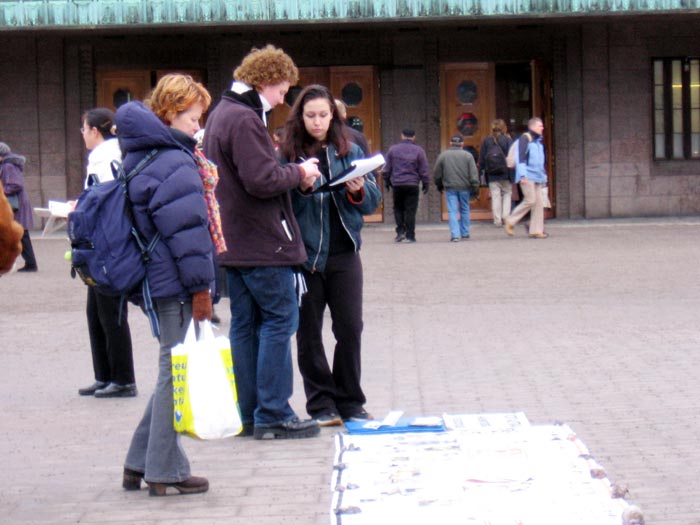 像往常一样,征签簿刚放好,马上就有人明白了真相来签名声援反迫害,这与法轮功学员六年来怀着慈悲之心不断向世人讲真相的努力是分不开的,明白真相的人越来越多,共产邪*党-的迫害也就越难维持,邪*党-把自己送入了坟墓。