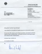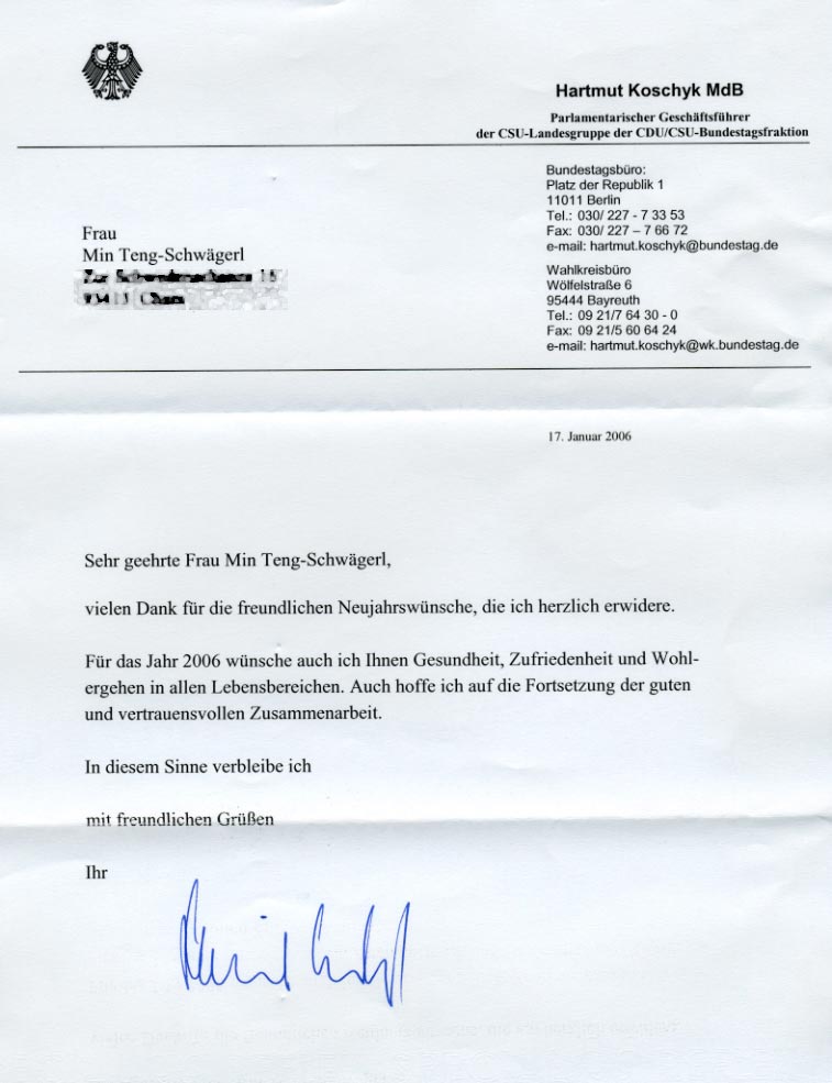 新年伊始,德国拜恩州法轮功学员滕女士收到德国议会议员,德国基督教社会联盟党派(CSU )地方议会执行主席哈姆特-考斯特(Hartmut Koschyk)的回信。考斯特议员在信中向滕女士衷心祝福新年,祝愿2006年滕女士健康如意,并预祝今后继续良好诚信的合作。