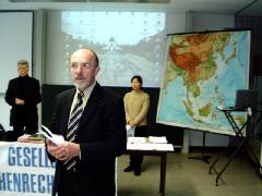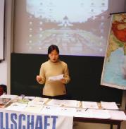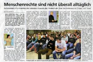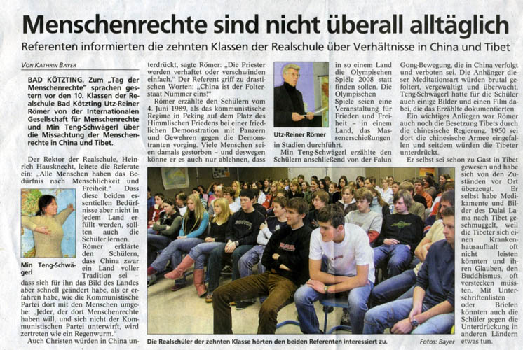 ![]() 克茨汀(kötzting)实科学校校长为人权报告做开场白,并感谢瑞姆先生和敏滕女士的到来。 | ![]() 诺陶布林高中(neutraubling)学生静静观看“自焚真相” |