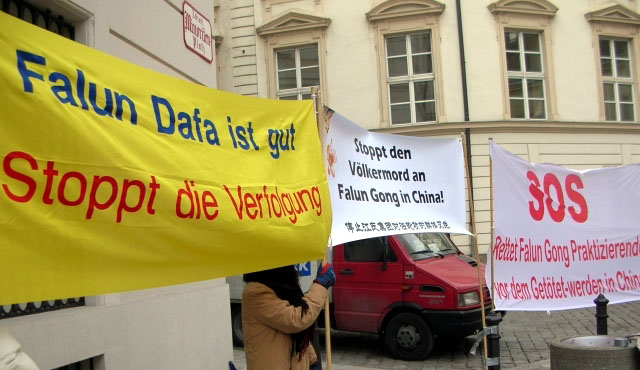 法轮功学员分别在奥地利外交部门外和中国代表团车队要经过的路边,举起横幅并展示祥和的功法。