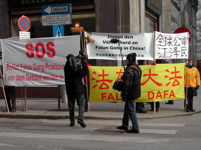 奥地利国家电视台对学员進行了现场采访和录像,在和平抗议活动结束后的2 小时内,就对法轮功学员这次和平抗议活动和中共政权对法轮功的残酷迫害做了报道。