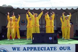 星期六,法轮功学员不断的在展位示范功法,并表演舞蹈,吸引了大批的观众。有的观众有兴趣进一步了解和学炼法轮功。