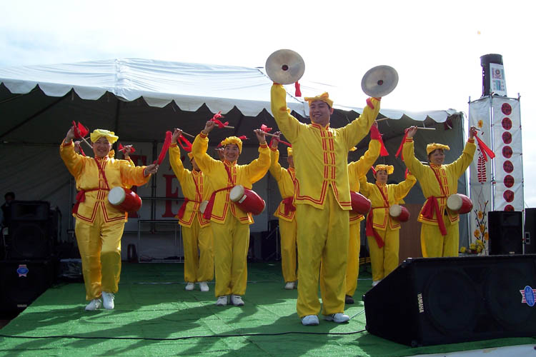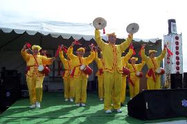 ![]() 法轮功学员在舞台上示范祥和的功法 | ![]() 表演舞龙 |