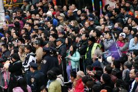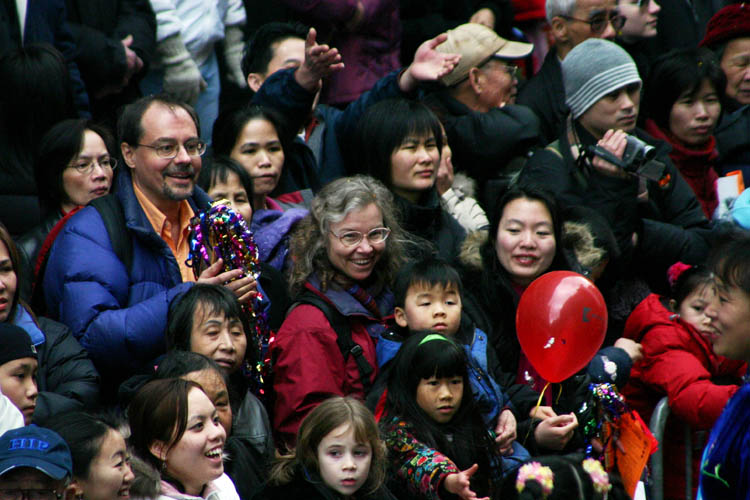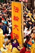 当法轮功学员的游行队伍经过主席台时,游行组织者繁荣华埠总会的主持人大声念出法轮功学员打出的横幅:“法轮大法好”,“真善忍”,并用“人山人海”来形容其阵容的庞大和壮观。