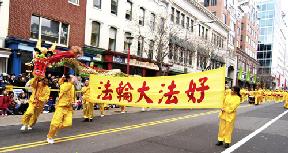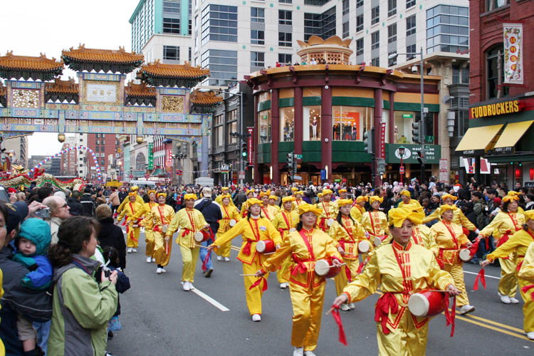当地的法轮功学员几年来一直参加中国城的新年游行。今年除了舞龙,还有几十名身着金黄色服装的法轮功学员组成的腰鼓方阵,伴随着“法轮大法好”的歌声,个个精神抖擞、意气风发,博得沿途观众的喝彩和掌声。