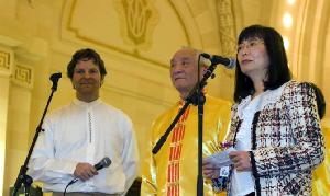 ![]() 向观众散发莲花和新年祝福 | ![]() 法轮功学员表演舞蹈 |
