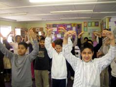 我本人及数位来自里兹和布雷德弗德(Bradford)的法轮功学员在二月十六日到了堤岸小学,教十到十一岁的三个班级法轮功功法。由于受限于场地大小,我们必须到各班级教功,因此每个班级仅有约三十分钟教功。我们决定最佳的方式是先播放由放光明电视台制作的名为“法轮功简介(Introduction to Falun Gong)”的法轮功录像带,之后的时间再教功。