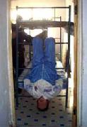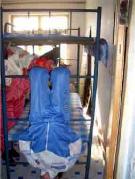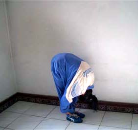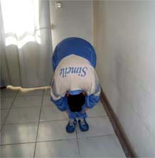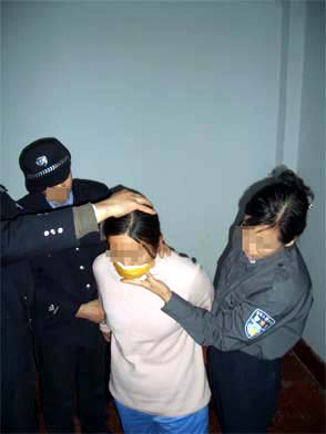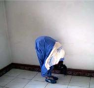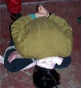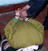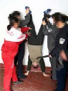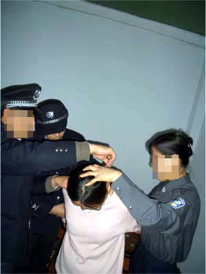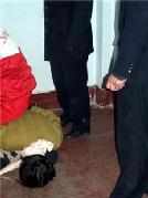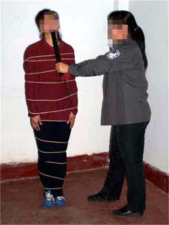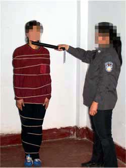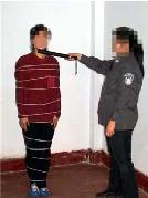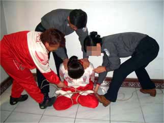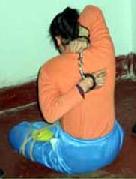 此种酷刑即是将法轮功学员的双腿双盘,用细绳勒紧捆实,双臂扳向背后,铐上双手。铐手的姿势分两种,如图17、18.被绑者几小时或十几小时不被放开,还经常被逼闻臭鞋、脏物,有的干脆被封口。此种酷刑是邪恶逼迫法轮功学员转化时惯用的卑鄙伎俩。2002年12月,在队长值班室,锦州法轮功学员王芳(40岁左右),被恶警董淑霞指使犹大施以此刑长达四个多小时,放开后致使左腿不能走路,失去知觉,左臂不能正常活动,耷拉着,手铐勒進皮肉里,至今仍留有疤痕。