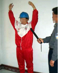 此种酷刑即是强迫法轮功学员双手臂上举,不许放下来,24小时不让睡觉,旁边有恶警监视。如稍有松懈,就会遭致电棍电击或暴打。恶警还用手掐法轮功学员的身体,法轮功学员身上被掐得青一块,紫一块,手臂由于长时间高举而酸痛乏力,身体哆嗦,大汗淋漓。