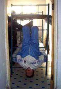 此种酷刑即是将法轮功学员的两小腿倒挂在单人床下铺侧面的横栏上,头朝下悬着,不着地,两手臂被反绑。遭受此酷刑的法轮功学员由于头部倒控、充血,胀得很大,几分钟就会感觉头晕目眩,呼吸急促。恶警王秀菊曾把法轮功学员张秀玲吊挂在床上,指使犹大打她的头,眼睛被打得青紫,还用点着的纸烧她的脸。
