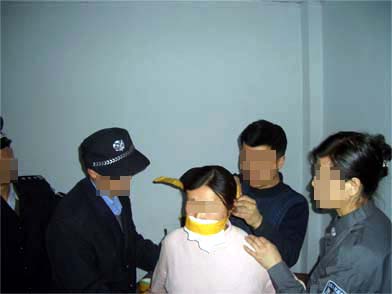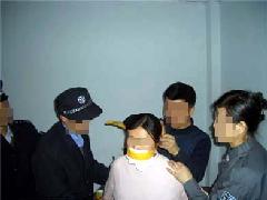 此种酷刑即是用胶带把法轮功学员的嘴、脸、头部都缠上,只露出两只眼睛,将手臂背到后面也用胶带缠上,然后進行毒打。法轮功学员刘殿琴被恶警任红赞用卫生纸堵住嘴,再用胶带一圈圈的缠上,对着刘的耳朵念污蔑大法的书。