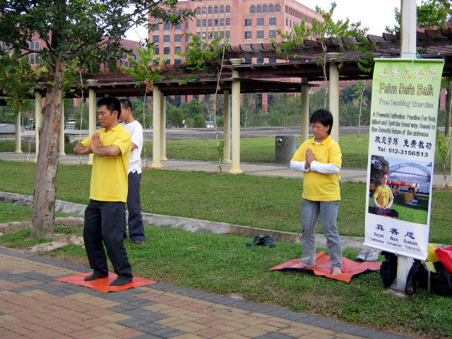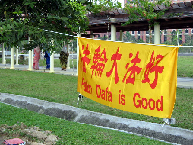 ![]() 悬挂在布城的“法轮大法好”横幅 | ![]() 在布城主要公路旁炼功 |