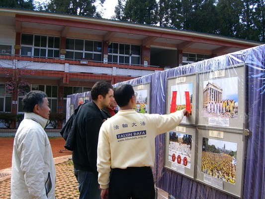 于是126幅照片就被一辆小卡车运上了阿里山,在香林国小没有围墙的操场上,一幅幅展现着法轮功真相的照片端端正正的挂在简单的铁架上,“这里时常有云雾,气候潮湿,我们把照片都套上一层透明塑胶布,才能保护照片不会沾上雾气。”学员说,展出的设备虽然简陋,但每一张照片都是法轮功修炼者在世界各地,不畏艰辛拍来的,画面不仅有深远的意涵,更表现出作者修炼的体悟,值得游客好好的来欣赏的。