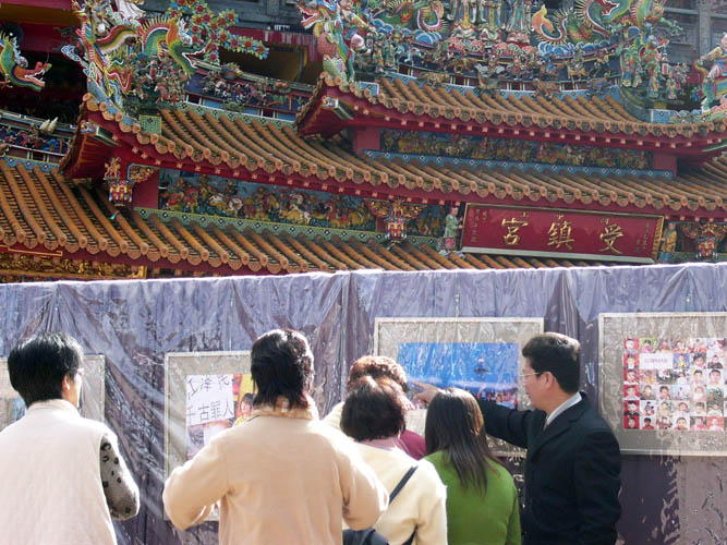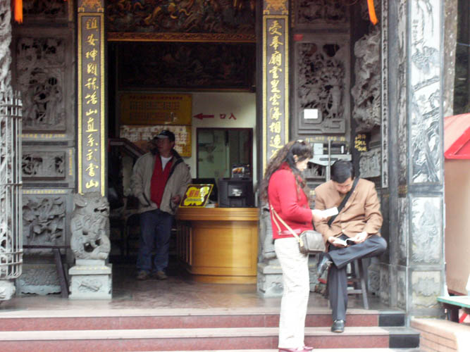 ![]() 两位大陆观光客拿着大法资料在受镇宫的飞檐下慢慢阅读 |