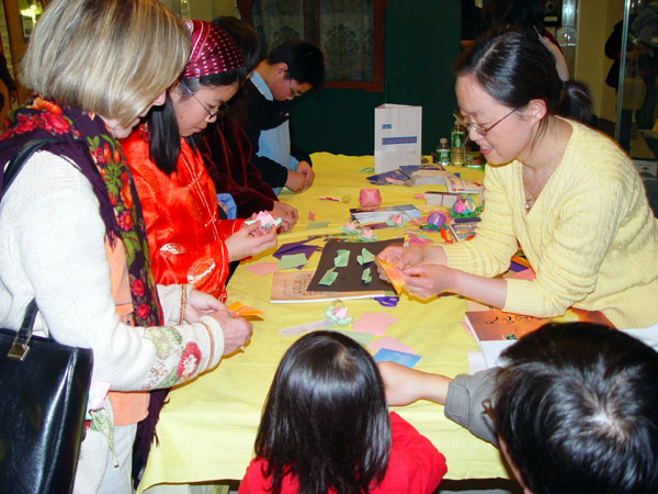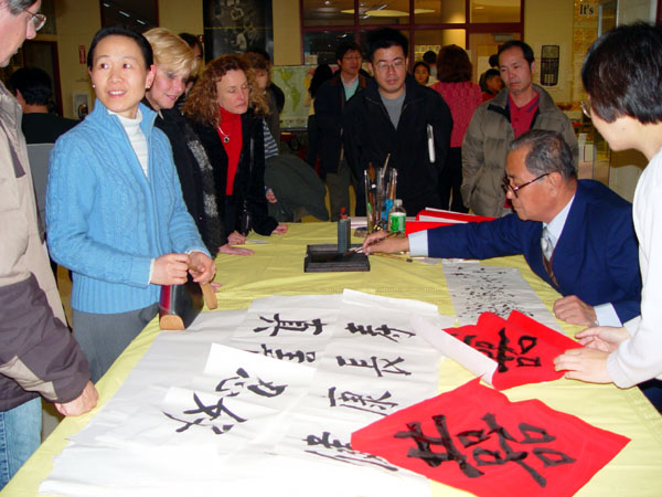 ![]() 耶鲁大学法轮功俱乐部的学员教折纸莲花 | ![]() 文化展上的书法赠字 |