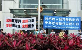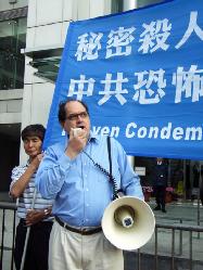 ![]() 英文大.纪.元;时报编辑斯蒂芬•格雷戈瑞在中联办外发言 | ![]() 数十名香港法轮功学员在中联办大楼后门对面行人道静坐抗议 |