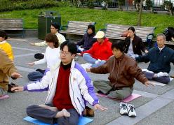 ![]() 祥和的炼功场面吸引人们的注意,有的还仔细阅读真相图片 |