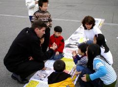许多过往路人被祥和的功法所吸引而驻足观看,有人还尝试学炼。讲真相的海报和横幅吸引了不同年龄的人们。人们仔细的听取学员善意的讲述中共对法轮功学员迫害之恐怖。