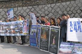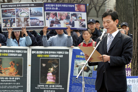 韩国法轮大法学会副会长崔锡正在集会上发表严正声明,强烈抗议中共恶党残酷迫害法轮功学员的法西斯行径,并呼吁全球各界关注和协助调查法轮功学员遭受中共残酷迫害的事实。