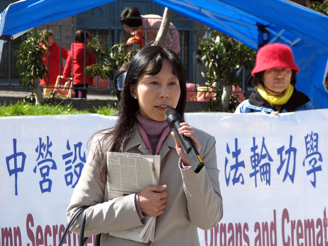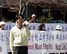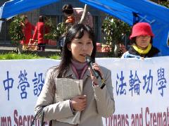 湾区法轮功学员程铭华在集会上陈述了多起经调查证实的,中共使用酷刑迫害虐杀法轮功学员,并摘除他们的器官的案例。她说,中共在沈阳集中营设焚尸炉,出售法轮功学员器官的报导刊登后,许多善良的人不敢相信,这灭绝人性的恶行就发生在我们的身边。江泽民早在99年就下令对法轮功学员打死白打死,不查身份,直接火化。她希望大家都阅读《·九·评*》,了解中共嗜血杀人的真实面目。
