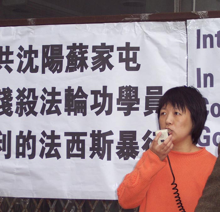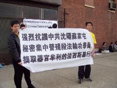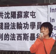 集会上,学员们打出了巨大的抗议横幅,分别用中英文写着:“抗议中共沈阳苏家屯秘密集中营残害法轮功学员,摘取器官牟取暴利的法西斯暴行!”学员代表神情严肃的用中英文高声朗读了来自明慧网的消息:一名中共内部人员透露,中共在沈阳市苏家屯区设立了一个类似法西斯的秘密集中营,关押着6000多名法轮功学员。该秘密监狱里有“焚尸炉”,还有大量的医生。据悉,凡進到这里的人没有活着出来的,焚尸前的内脏器官都被掏空了。这个消息经过知情人的多方考证。此消息令人相当震惊。 正如那位知情人士质问:如果一个教养院或一个拘留所里弄死了人那是个大事,那不是个小事。监狱把人整死了,拉到火葬场去烧,但苏家屯秘密设施里为什么要弄一个焚尸炉?它要那么多医生去干什么?