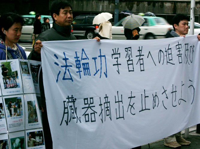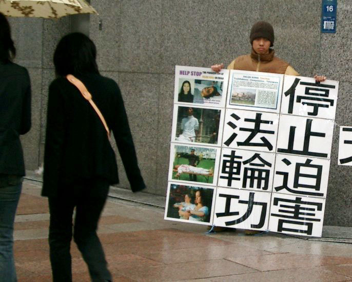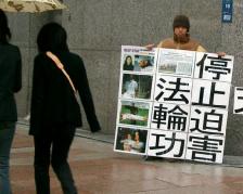 法轮功学员在名古屋中领馆前和平抗议学员们冒着小雨,打着写有“停止对法轮功学员的迫害,停止对法轮功学员进行摘取内脏器官的暴行”的横幅,并举着写有“停止迫害法轮功”等字样的图片,向过往行人说明中共迫害法轮功的真相,及其所使用的流氓手段。过往行人无不被横幅和图片内容所震惊。