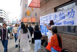 星期天中午虽然下着小雨,法轮功学员也照常来到中国城,在细雨蒙蒙之中打着横幅,把中共这一恶行曝光于天下,要求立即停止对善良的法轮功学员的迫害。这天是费城花展的最后一天,许多人来到临近花展的中国城,在学员真相广播声中接受了关于暴行的传单。费城警察局的官员在十街上值勤,负责维持秩序,他说他也知道这一暴行,对学员表示支持。