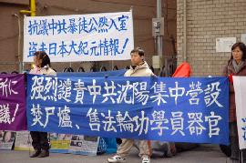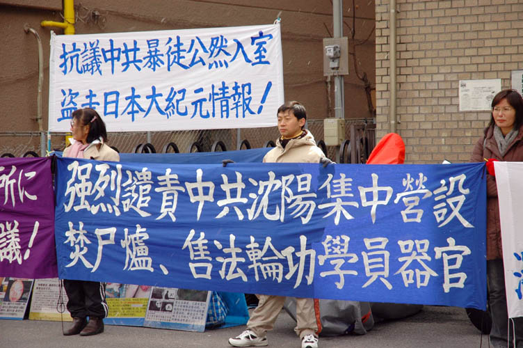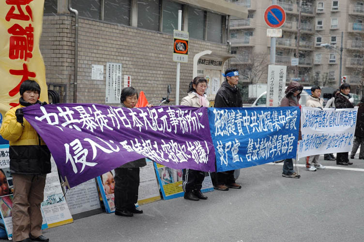 为了抗议中共令人发指的法西斯暴行,日本大阪的3位法轮功学员开始在中领馆前進行24小时绝食抗议,3月13日,学员们举行了集会并宣读了抗议书。