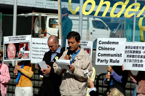 ![]() 中国民主运动新西兰负责人潘晴发言 | ![]() 著名人权大律师凯瑞发言 |