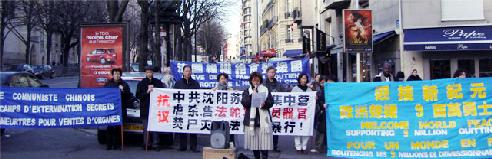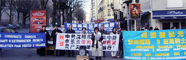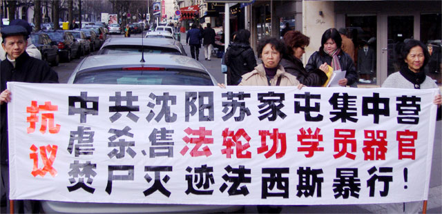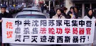 2006年3月15日下午3点,法国法轮功学员在中共驻法使馆前揭露抗议中共秘设纳粹式集中营,残害、虐杀法轮功学员,出售盗取的人体器官牟取暴利后,焚尸灭迹的魔鬼邪恶行径。并呼吁国际社会高度关注、调查苏家屯集中营事件,共同制止中共对法轮功学员残害和虐杀的法西斯暴行。