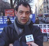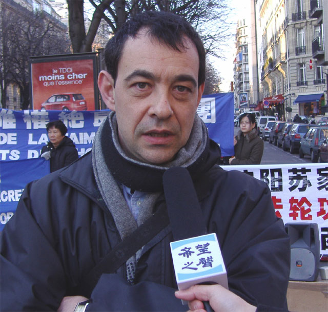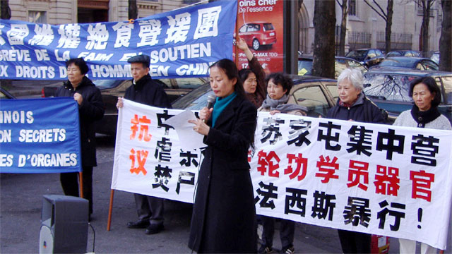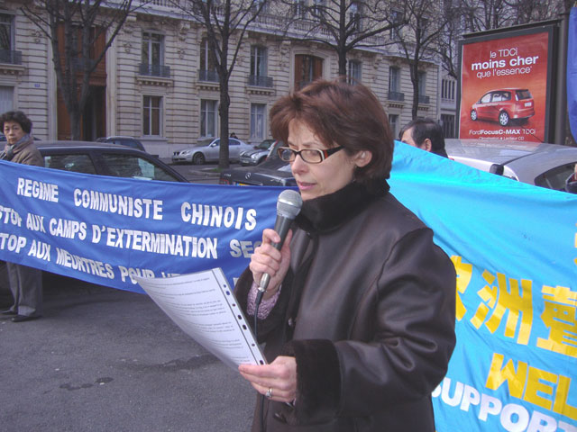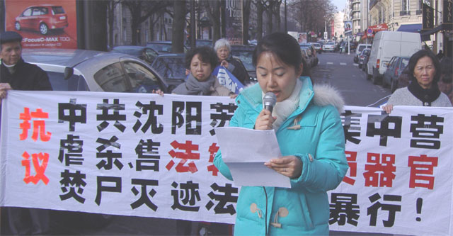 法国法轮大法协会代表多梅妮珂(Dominique)接受记者采访讲到:“今天我们在这里以和平的方式抗议和揭露中共秘密集中营灭绝法轮功学员的罪行。中共设立集中营关押法轮功学员,在2006年的今天,就如同第二次大战期间欧洲纳粹建立的集中营一样,我们强烈抗议中共的暴行,呼吁立即制止对法轮功的迫害。在中国买卖人体器官是事实,现在中共设立集中营虐杀法轮功学员、活体摘取学员身体器官,这是不能容忍的!”