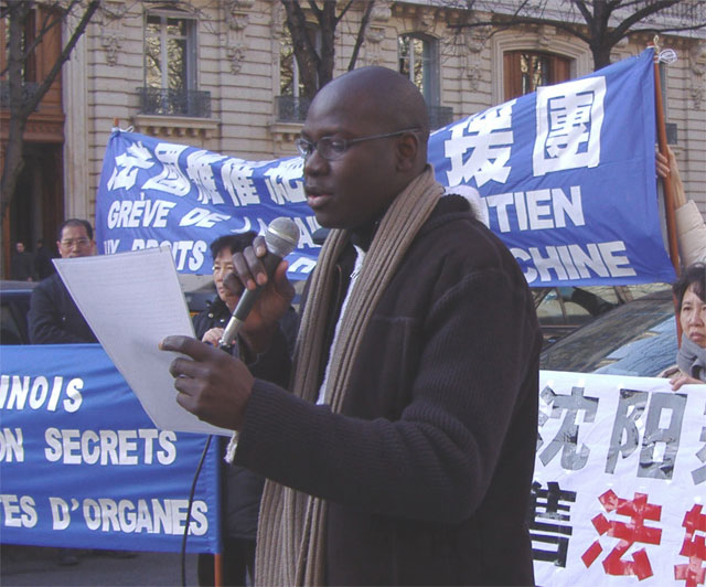 法轮功学员马姆杜在集会上发言抗议中共暴行,他告诉记者:“我听说了在中国有一个灭绝性集中营关押法轮功学员,我觉得太严重了,所以我今天来这里想让跟多的人知道这件事。”
