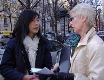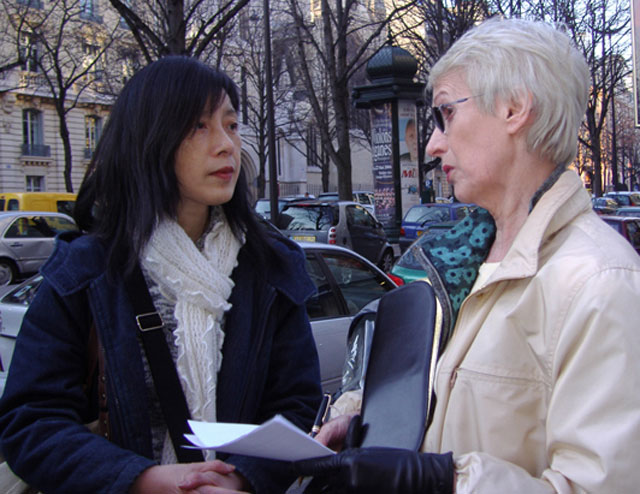 ![]() 法国大学的教授马德琳娜向法轮功学员了解真相 |