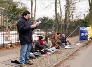 学员手中拿着揭露集中营的画面,对路人做解释,呼吁人们关心这一21世纪的群体灭绝罪行,制止中共恶行,并伸出关心之手,救援善良的法轮功学员。明白了情况的路人,有的说,我们都知道中国一直以来存在着践踏人权的问题,但是没有想到在现在,居然发生如此令人不可思议的事情。我如何能帮助你们?有的说,如果有可能的话,请在报纸上或采取其它有效的方法,让更多的人了解中共政权的邪恶。