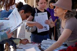 ![]() 在“制止中共虐杀无辜”签名表上签名 | ![]() 过往学生仔细阅读真相展板 |