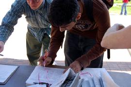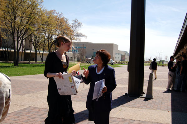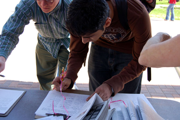 中午时分,来往于Student Union 和图书馆的师生熙熙攘攘,当看到新闻发布会的横幅及图片展,纷纷停下脚步,了解所发生的事情。当他们看到法轮功学员演示的功法后,对仅仅因为修炼这一和平的功法而遭受中共如此的迫害和虐杀表示无法理解和容忍。学生们纷纷在“制止中共虐杀无辜”的签名表上签名。也有些过往师生对法轮功的功法很感兴趣,当场学炼法轮功。