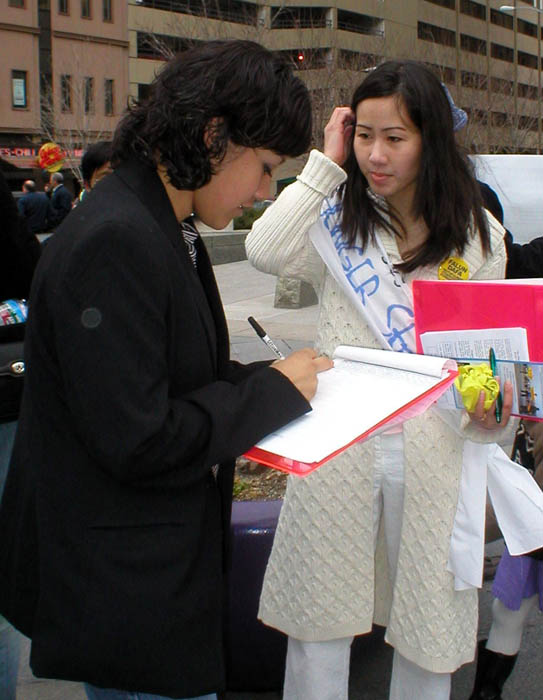 ![]() 州政府前举行新闻发布会 | ![]() 一位年轻妇女在呼吁书上签名,她对中共苏家屯集中营的暴行感到震怒。 |