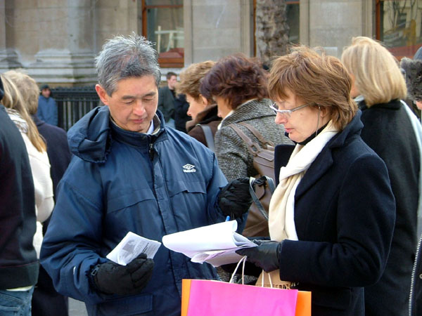 ![]() 路人驻足观看真相图片; | ![]() 向路人讲真相; |